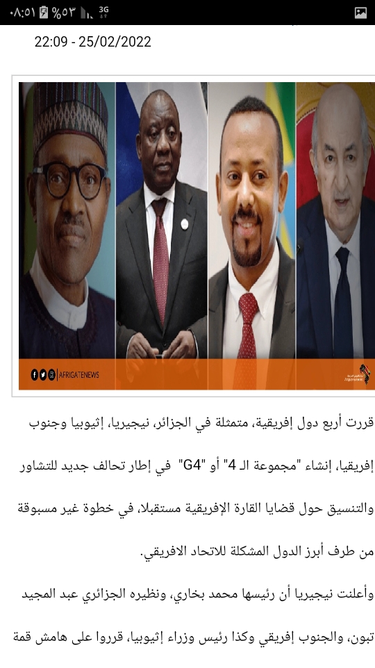 وأعلنت نيجيريا أن رئيسها محمد بخاري، ونظيره الجزائري عبد المجيد تبون، والجنوب إفريقي وكذا رئيس وزراء إثيوبيا، قرروا على هامش قمة بروكسل بين الاتحادين الأوروبي والافريقي، تأسيس “مجموعة الأربعة G4″، للتشاور والتنسيق من أجل حلول عملية وفعالة لمختلف القضايا التي تواجه القارة الأفريقية.