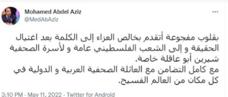 وكتب ولد عبد العزيز أنه يتقدم "بخالص العزاء إلى الكلمة بعد اغتيال الحقيقة، وإلى الشعب الفلسطيني عامة، ولأسرة الصحفية شيرين أبو عاقلة خاصة. مع كامل التضامن مع العائلة الصحفية العربية والدولية في كل مكان من العالم الفسيح".