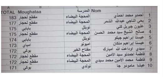 وكالة السواحل للانباء(نواكشوط):تصدر التلميذ أحمدو محمد أحمذي من مدرسة المحجة البيضاء مقاطعة مقطع لحجار نتائج مسابقة دخول السنة الأولى إعدادية بمعدل 183 نقطة