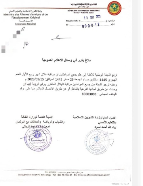 نواكشوط(وكالة السواحل للأنباء):دعت اللجنة الوطنية للأهلة المواطنين إلى مراقبة هلال شهر بيع الأول من العام 1445 هجرية مساء يوم غد الجمعة.