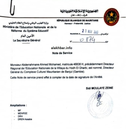 نواكشوط(وكالة السواحل للأنباء):وقع الأمين العام لوزارة التهذيب الوطني وإصلاح النظام التعليمي سيدي ولد مولاي الزين أمس الثلاثاء مذكرة أجرى بموجبها تغييرات في صفوف المديرين الجهويين للتعليم، كما وقع مذكرة أخرى عين بموجبها مديرا عاما للمجمع الثقافي الموريتاني في غامبيا.