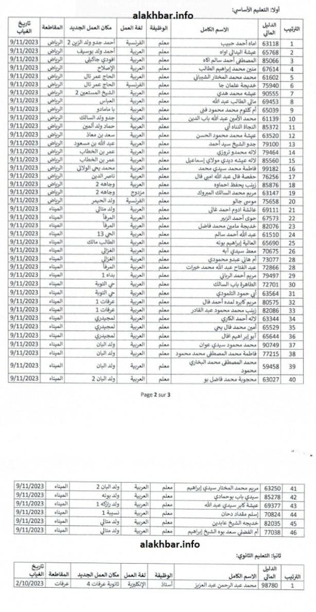 وتضمنت إحدى اللوائح الصادرة عن وزارة التهذيب الوطني اليوم الجمعة أسماء 46 معلما يعملون في ولاية نواكشوط الجنوبية، فيما ضمت اللائحة أستاذ إنجليزية يعمل في نفس الولاية.