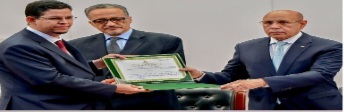 وقد سلم فخامة رئيس الجمهورية جائزة شنقيط للعلوم والتقنيات التي فاز بها الدكتور معاوية ولد سيدي عن بحثه المعنون: “النمذجة الرياضياتية والمحاكاة الرقمية في مجال الطاقة”.