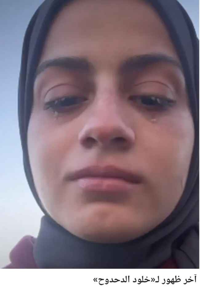 وكان آخر ظهور لـ«خلود الدحدوح» منذ شهر تقريبًا من أمام قبور أفراد أسرتها، الذين توفوا في القصف الإسرائيلي على غزة، وظهرت خلال مقطع فيديو وهي تبكي بحرقة، خاصة أنها لم تستطع زيارتهم إلا بعد عدة أيام من وفاتهم، قائلة: «كنت أنا وأخي محمود، متعودين نصور فيديوهات مع بعض، واليوم الفيديو موجودة فيه بمفردي، الحمد لله ليس خسارة في ربهم ولا وطنهم».