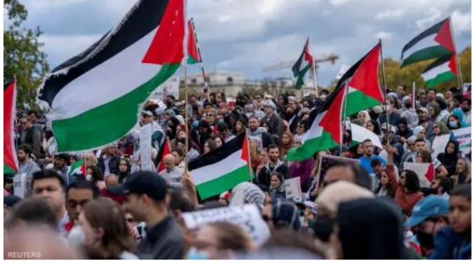 وطالب المتظاهرون بوقف إطلاق النار والإقرار بوجود دولة فلسطينية حقيقية، لحماية المدنيين الأبرياء في القطاع، بالإضافة إلى محاكمة المتورطين في هذه المجازر البشرية.