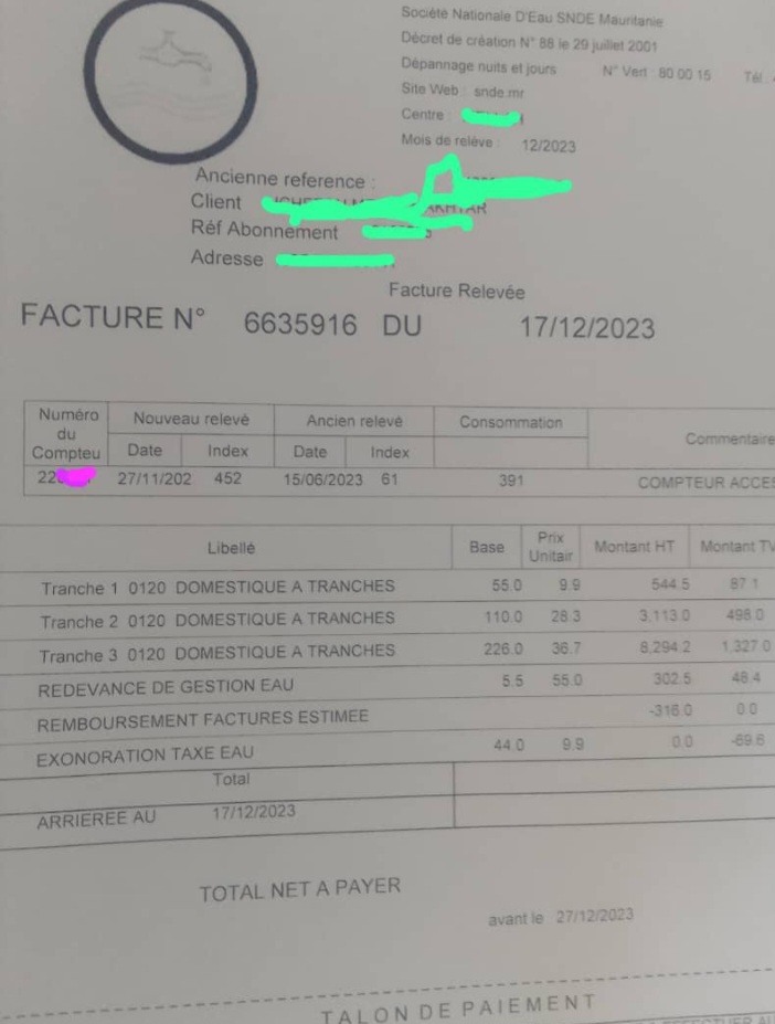 الفئة 1: 0-20 م3 لكل شهرين: 9.9 أوقية للمتر المكعب