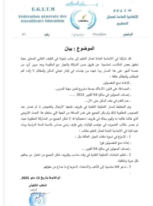 وجاء فى بيان الاتحادية أنّ من بين تلك المطالب إعادة دمج المفصولين، والمصادقة على قانون الأسلاك بصيغة مشروع تثمين مهنة المدرس، مع إنصاف المحولين في مذكرة 04 أكتوبر 2024، و عدم التقدم في ملف السكن حتى الآن، وفقا للاتحادية.