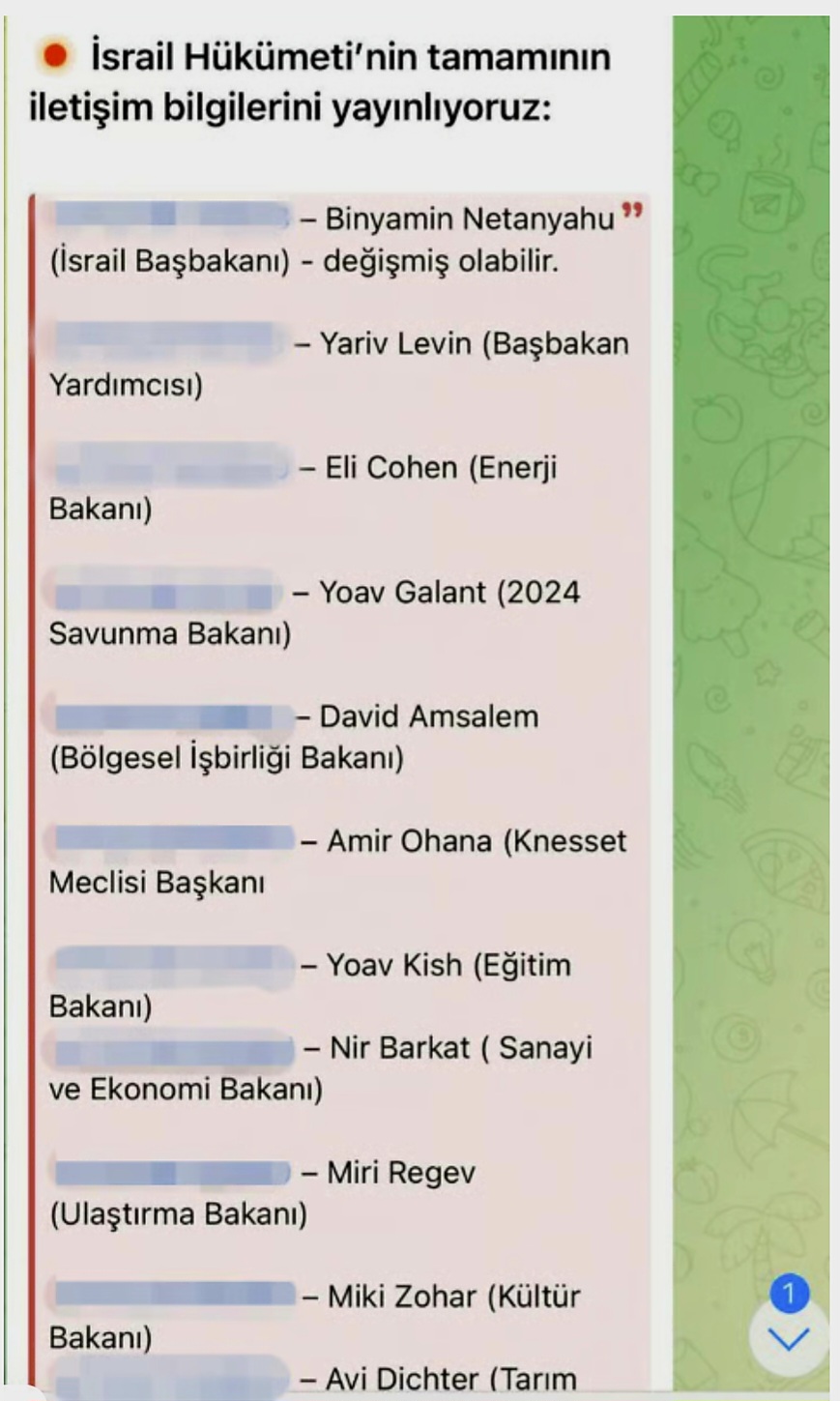 بعد هجوم سيبراني شنه قراصنة أتراك ضد وزير الدفاع الصهيوني يسرائيل كاتس، نشرت مجموعة على منصة "إكس" أرقام هواتف 11 وزيرا في الحكومة بالإضافة إلى رئيس الكنيست أمير أوحانا.