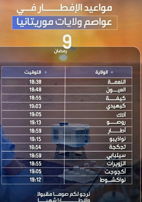 وهذه أوقات الإفطار في عواصم ولايات موريتانيا بالنسبة لليوم التاسع من شهر رمضان 1447 ه.