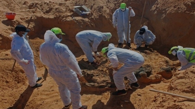 أصدرت المحكمة الجنائية الدولية مذكرات اعتقال بحق 6 ليبيين يشتبه في ارتباطهم بإحدى الميليشيات المسؤولة عن عدة جرائم قتل في إحدى المدن التي تم اكتشاف مقابر جماعية بها عام 2020.