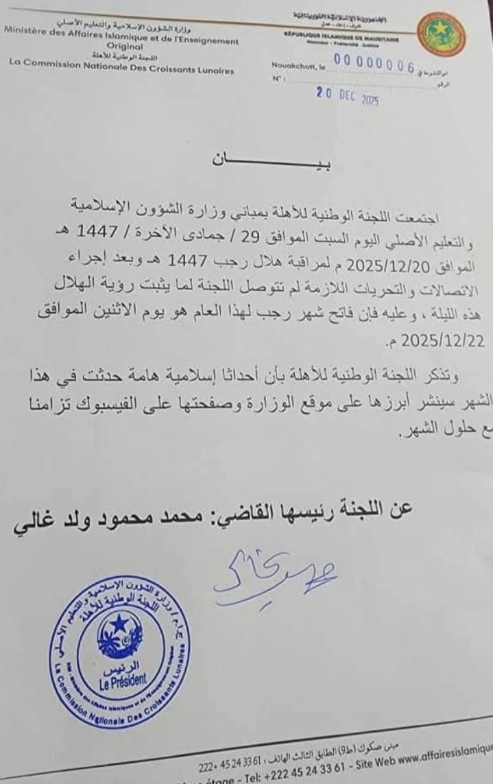 أعلنت اللجنة الوطنية للأهلة،غى بيان رسمى لها مساء امس ليلة الاحد، أن غدا يوم الإثنين الموافق لـ22 دجمبر 2025 هو فاتح شهر رجب من العام الهجري 1447.