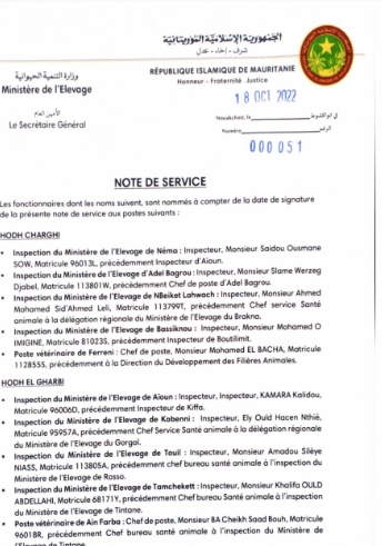وكالة السواحل للأنباء(نواكشوط):انتقدت نقابة العاملين في الصحة العمومية البيطرية تحويلات مفتشي المقاطعات والتي وقعها الأمين العام لوزارة التنمية الحيوانية امادي ولد الطالب أمس الثلاثاء وشملت مختلف ولايات البلاد.