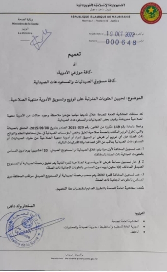 وكالة السواحل للأنباء(نواكشوط):أعلنت وزارة الصحة تحيين العقوبات المترتبة على توزيع وتسويق الأدوية منتهية الصلاحية، مؤكدة أن عقوبات بيع أو توزيع أدوية منتهية الصلاحية قد يترتب عليها سحب رخصة مرتكب المخالفة.