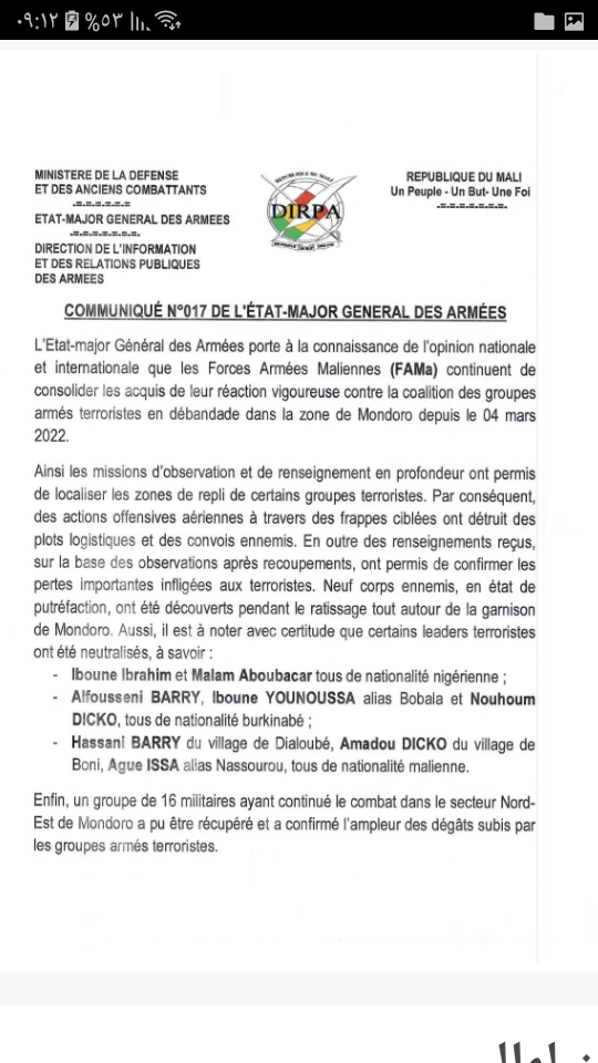 أعلن الجيش المالي مقتل 9 مسلحين في منطقة "موندورو"، حيث تعرض قبل أيام لأكثر هجوم دموية منذ أشهر، قتل وجرح على إثره عشرات الجنود الماليين.