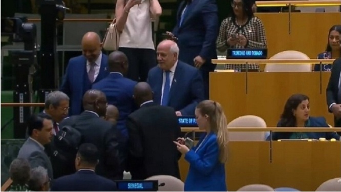 في لحظة تاريخية، جلس مندوب فلسطين الدائم لدى الأمم المتحدة السفير رياض منصور، على مقعد رسمي في الجمعية العامة للأمم المتحدة، ووُضعت أمامه لافتة كتب عليها "دولة فلسطين".