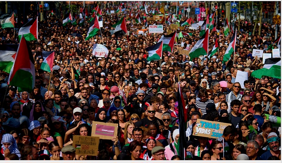 تتواصل التظاهرات المؤيدة لفلسطين لليوم الثالث على التوالي في مدينة برشلونة الإسبانية، إذ تشهد منذ صباح السبت مسيرة ضخمة شارك فيها مئات الآلاف من المتظاهرين.