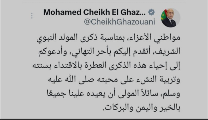 هنأرئيس الجمهورية، محمد ولد الشيخ الغزواني، المواطنين بمناسبة حلول ذكرى المولد النبوي الشريف، وحثهم على الاقتداء بسنة المصطفى عليه الصلاة والسلام وتربية الابناء على محبته صلى الله عليه وسلم.