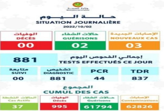 وكالة السواحل للأنباء(نواكشوط): أعلنت وزارة الصحة تسجيل 03 إصابات جديدة بفيروس كورونا و02 حالة شفاء دون تسجيل أي حالة وفاة مرتبطة بالفيروس خلال 24 ساعة الأخيرة.