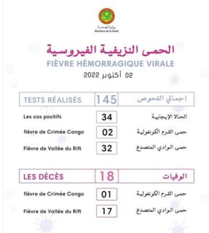وسجلت الوزارة في نشرتها الخاصة بالحمى النزيفية الفيروسية، 34 إصابة جديدة منها 32 بحمى الوادي المتصدع، و 2 بحمى القرم.