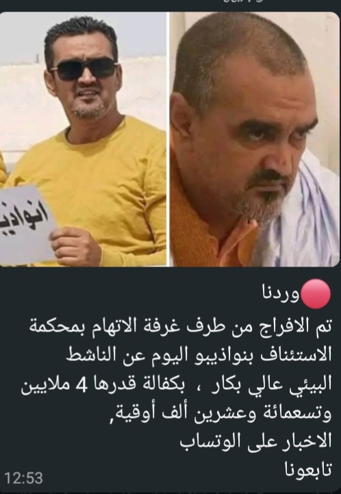 قال المدون لحبيب صمب فى تدوينة ان محكمة نواذيبو افرجت عن المدون علي بكار بكفالة مالية أكثر من 4 ملايين اوقية.
