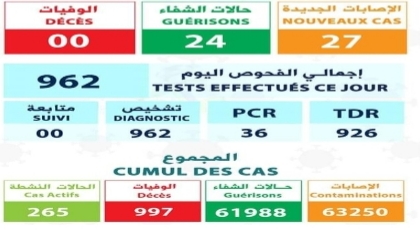 وتوصلت المصالح الصحية لهذه النتائج بعد إجراء 962 فحصا، بينها 926 من الفحوص السريعة و 36 من فحوص الحمض النووي.