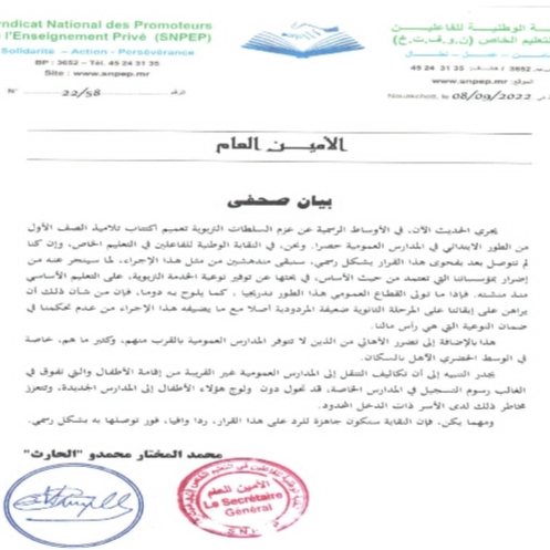 وكالة السواحل للأنباء(نواكشوط):عبرت نقابة الفاعلين في التعليم الخاص عن دهشتها من قرار حصر السنة الأولى ابتدائية على التعليم العام، معتبرة أن ذلك ستترتب عليه أضرار بالغة لمنتسبيها.