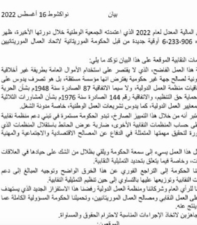 وكالة السواحل للأنباء(نواكشوط):وصفت مركزيات نقابية عمالية في بيان مشترك تخصيص الحكومة دعما ماليا في ميزانية 2022 المعدلة لصالح اتحاد العمال الموريتانيين بأنه استفزاز «يستهدف القضاء على العمل النقابي ومصالح العمال الموريتانيين».