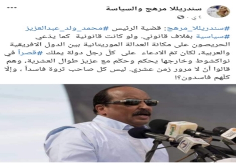وكالة السواحل للانباء(نواكشوط):- وصفت محامية الرئيس السابق محمد ولد عبد العزيز، اللبنانية سندريلا مرهج قضية موكلها بأنها "سياسية بغلاف قانوني." وأكدت، في صفحتها على فيسبوك، انه "ليس كل صاحب ثروة فاسداً، وإلّا كلّهم فاسدون؟!"