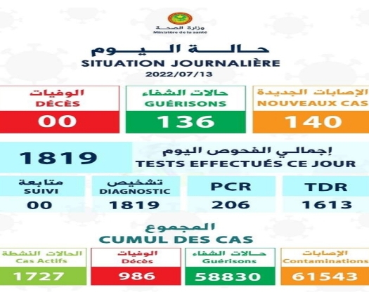 وكالة السواحل للانباء(نواكشوط):اعلنت وزارة الصحة مساء اليوم تسجيل 140 إصابة جديدة بفيروس كورونا، و 136 حالة شفاء دون تسجيل وفيات جديدة بالفيروس وذلك خلال ال 24 ساعة الأخيرة.