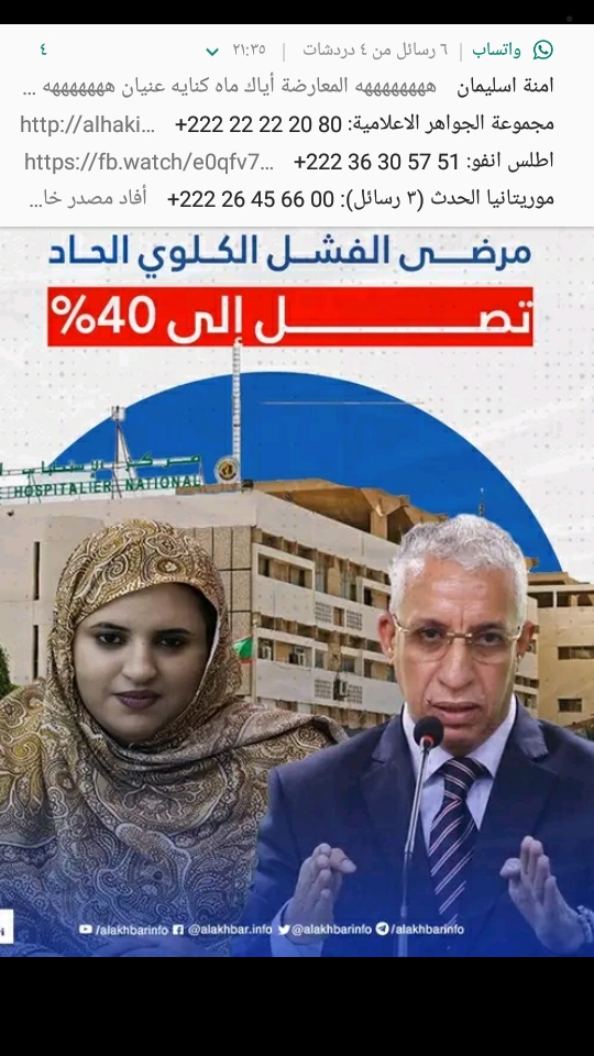 كالة السواحل للأنباء(نواكشوط): كشف تقرير رسمي قدم خلال اجتماع الحكومة الأخير أن نسبة الوفيات المرتبطة بالفشل الكلوي الحاد قد تصل إلى 40% في البلاد، وذلك اعتمادا على بيانات مركز الاستطباب الوطني، فيما قدر التقرير نسبة الوفيات المرتبطة بالفشل الكلوي المزمن (مرحلة غسيل الكلى) ما بين 15و20%.