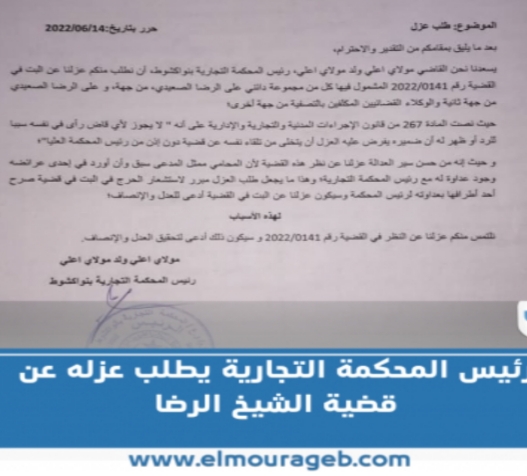 وكالة السواحل للانباء(نواكشوط):وجه رئيس المحكمة التجارية بنواكشوط القاضي مولاي أعلي مولاي أعلي طلبا الى رئيس المحكمة العليا يرمي الى عزله عن الملف رقم141/2021 المتعلق بديون الشيخ الرضا،