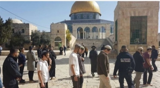 وذكرت وكالة الأنباء والمعلومات الفلسطينية (وفا) اليوم، أن "المستوطنين اقتحموا الأقصى على شكل مجموعات من جهة باب المغاربة، وأدوا طقوسًا تلمودية عنصرية، ونفذوا جولات استفزازية في باحاته".