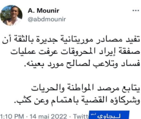 وكالة السواحل للانباء(نواكشوط):أفاد رئيس مرصد المواطنة والحريات عبد الله ولد المنير بأن صفقة إيراد المحروقات التي أبرمتها الحكومة الموريتانية مؤخرا عرفت عمليات فساد وتلاعب لصالح أحد المورّدين.