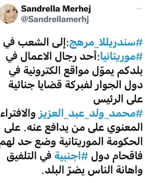 وكالة السواحل للانباء(نواكشوط):نشرت المحامية اللبنانية سندريلا مرهج تعليقا على الأحاديث الدائرة عن ورود اسم موكلها الرئيس السابق محمد ولد عبد العزيز في خبر تم تداوله قبل ساعات حول اكتشاف شبكة لتهريب الأموال في ألمانيا.