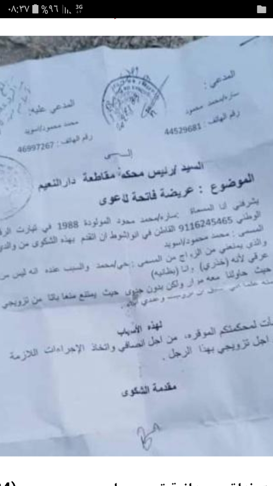 تقدمت فتاة موريتانية تدعى ساره محمد محمود (34 سنة) بشكوى قضائية ضد والدها محمد محمود اسويدي، وذلك بسبب رفضه زواجها من رجل يدعى حي محمد، بحسب وثيقة تم تداولها اليوم عبر منصات وسائل التواصل الاجتماعي.