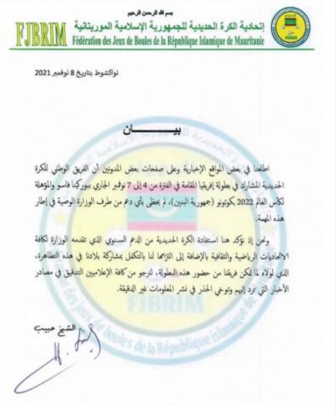 وأضافت الاتحادية في بيان توصلت وكالة "موريتانيا اليوم" بنسخة منه أن ماتم تداوله من عدم تلقي الفريق الوطني المشارك في بطولة إفريقيا للكرة الحديدية خبر كاذب