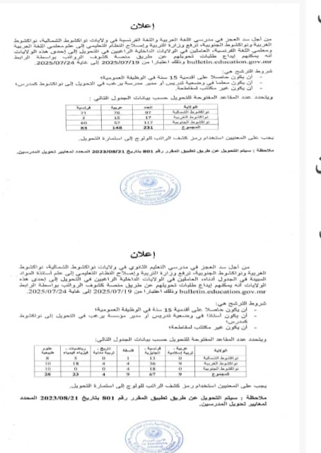أعلنت وزارة التربية عن فتح مجال التحويل أمام الأساتذة والمعلمين العاملين في الولايات الداخلية إلى المقاعد الشاغرة في ولايات نواكشوط الثلاث.
