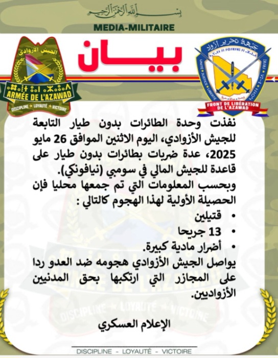 أعلنت جبهة تحرير أزواد فى بيان لها انها استهداف الجيش بطائرات بدون طيار.