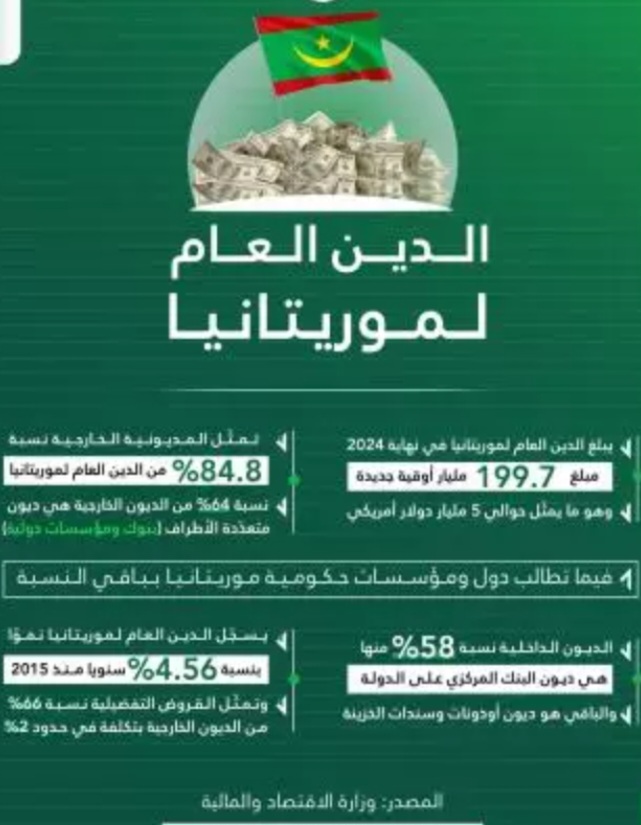 كشفت بيانات صادرة عن وزارة الاقتصاد والمالية أن نواكشوط مدانة بمبلغ 199.7 مليار أوقية جديدة، مع نهاية عام 2024.