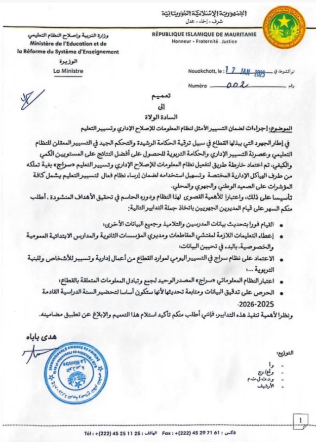 وطالب التعميم الولاة بإعطاء التعليمات اللازمة لمفتشي المقاطعات ومديري المؤسسات الثانوية والمدارس الابتدائية العمومية والخصوصية، بالبدء في تحيين البيانات.