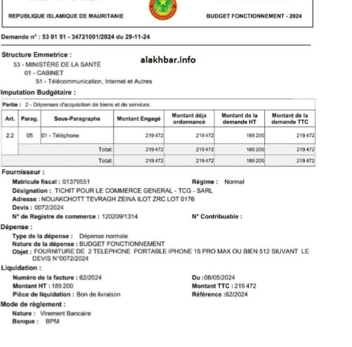 وتمكن المصدر من الحصول على وثيقة تبين أن وزارة الصحة اقتنت شهر مايو الماضي هاتفين من نوع "أيفون 15" بأكثر من مليوني أوقية قديمة، وهو سعر يقارب ضعف سعرهم المعلن من طرف شركة "آبل"، وكذا أسعارهم في الأسواق الموريتانية.