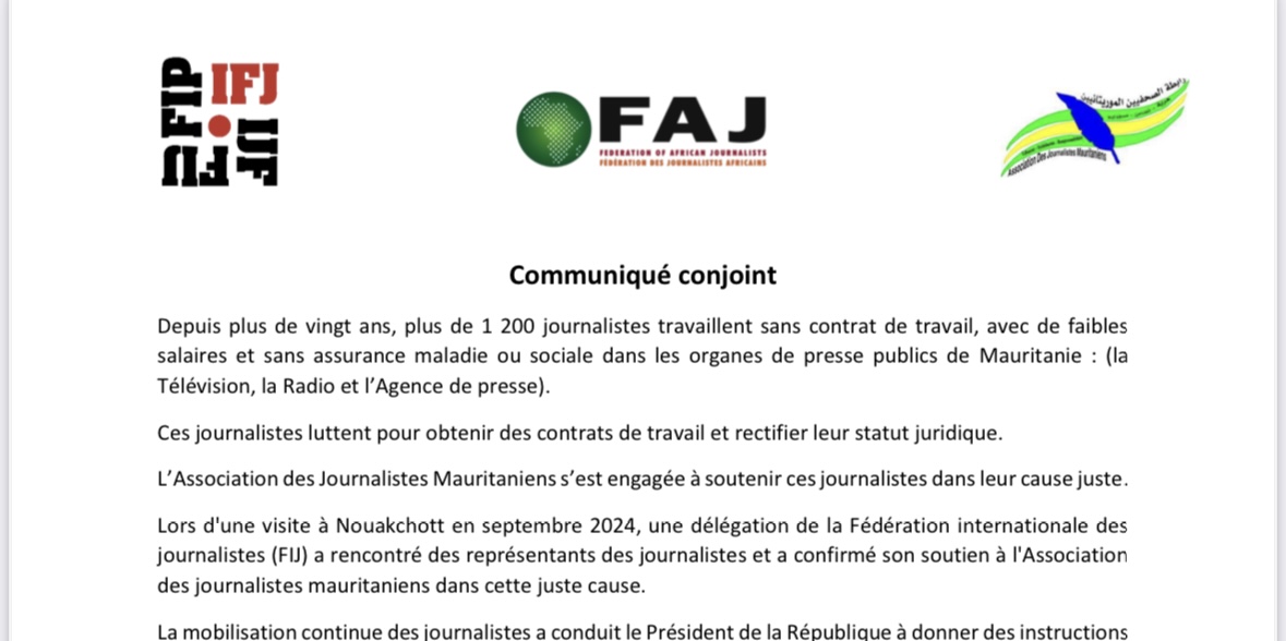 دعت رابطة الصحفيين الموريتانيين، والاتحاد الدولي للصحفيين (FIJ) وفيدرالية الصحفيين الأفارقة، إلى الحكومة الموريتانية الى تسريع تسوية الأوضاع القانونية والمهنية للصحفيين العاملين في وسائل الإعلام العمومية ، بعد أكثر من عقدين من العمل دون عقود رسمية أو ضمانات اجتماعية.