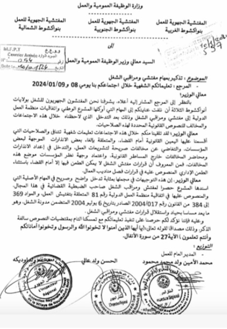 نواكشوط-وكالة السواحل للانباء: وقع المفتشون الجهويون بولايات نواكشوط الثلاث رسالة مشتركة إلى وزير الوظيفة العمومية والعمل سيدي يحيى ولد شيخنا، وصفوا فيها تعليماته بأنها «تتنافى والصلاحيات التي أقسمنا عليها اليمين القانونية أمام القضاء».