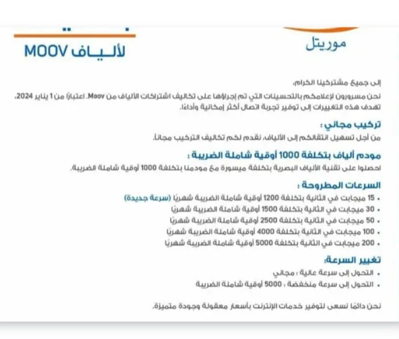 نواكشوط -وكالة السواحل للأنباء: أعلنت شركة موف موريتل للاتصالات عن مجموعة من التحسينات التي تم اجراؤها على خدماتها المتعلقة بتكاليف اشتراكات الألياف من MOOV، وذلك ابتداء من 1يناير 2024،حيث تهدف هذه التغييرات – حسب الإعلان -الى توفير تجربة اتصال أكثر إمكانية وأداء.