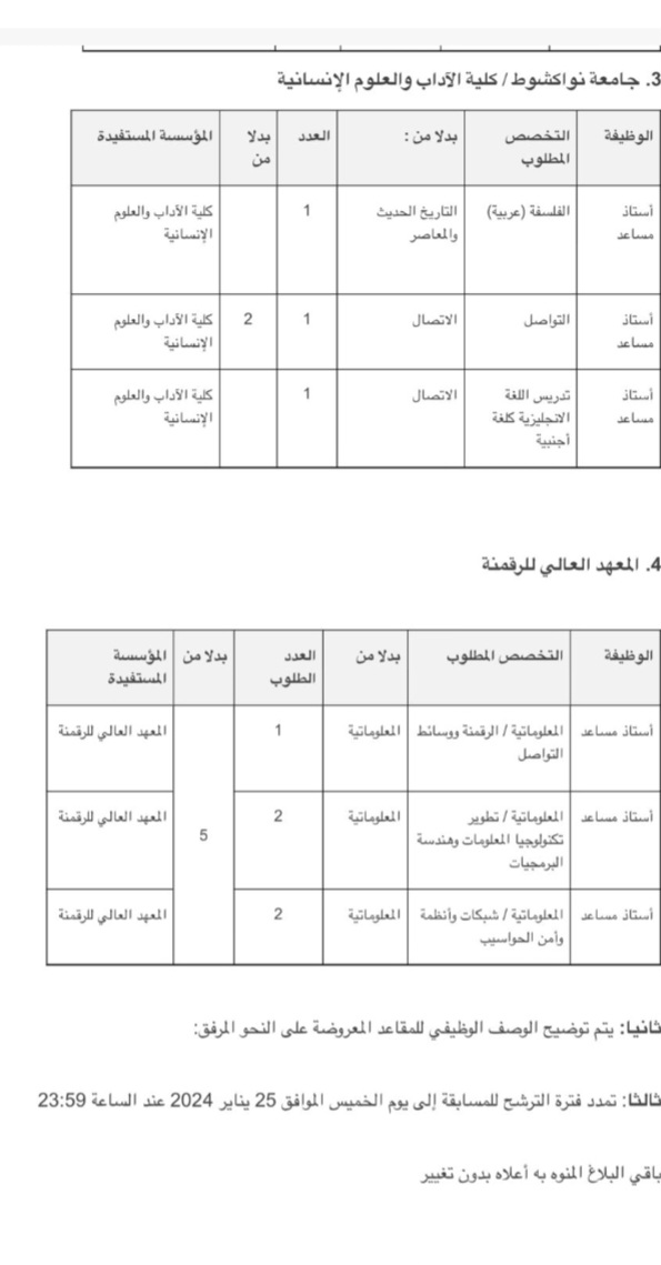 نواكشوط -وكالة السواحل للأنباء: أعلنت اللجنة الوطنية للمسابقات مساء اليوم الخميس تمديد فترة استقبال ملفات الترشح لمسابقة اكتتاب 100 أستاذ للتعليم العالي إلى 25 يناير الجاري، وذلك قبل ساعات محدودة من الموعد الذي كان محددا لانتهاء هذا الأجل.