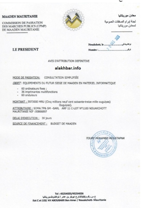 نواكشوط(وكالة السواحل للأنباء): منحت لجنة إبرام الصفقات العمومية بشركة معادن موريتانيا صفقتي تأثيث مقر شركة معادن موريتانيا الجديد بمبلغ 200 مليون أوقية قديمة، لشركتين إحداهما لنائب مقاطعة كنكوصة الشريف سيدي عالي محمد الأمام، والثانية لشقيقه العربي سيدي عالي محمد الأمام.