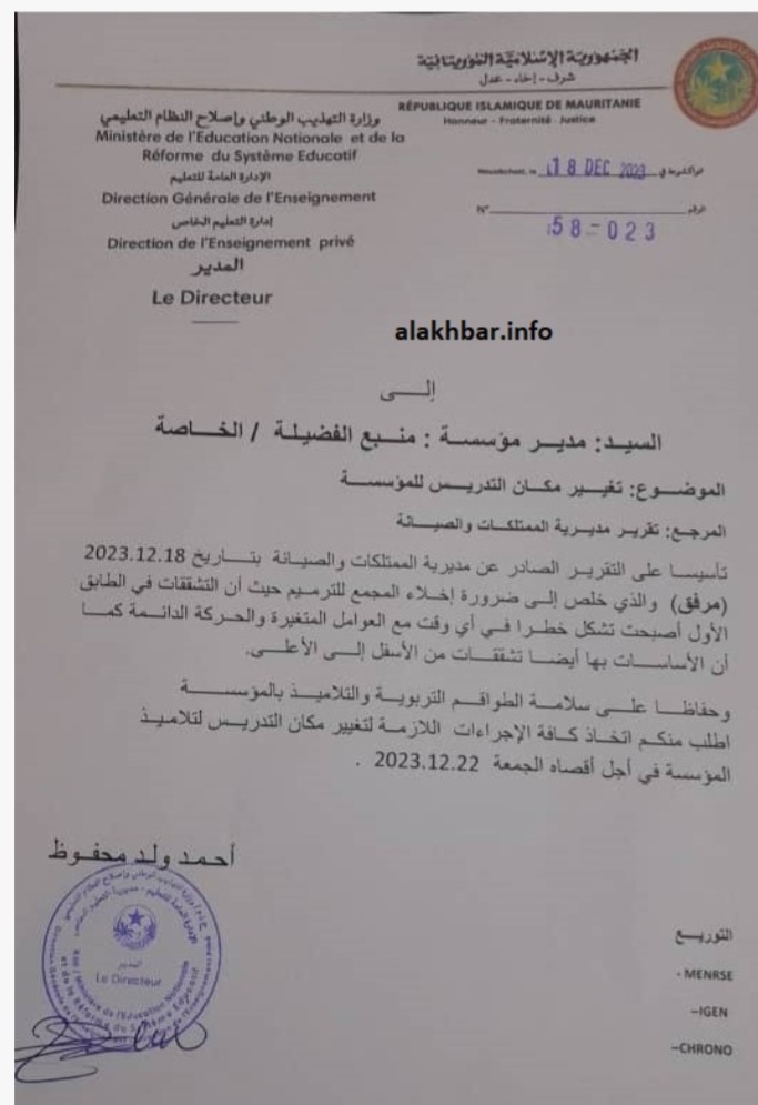 نواكشوط (وكالة السواحل للأنباء):وجهت وزارة التهذيب الوطني وإصلاح النظام التعليمي إنذارا إلى مدرسة "منبع الفضيلة" الخاصة في مقاطعة تفرغ زينة بولاية نواكشوط الغربية، وأمرتها باتخاذ الإجراءات اللازمة لتغيير مكان تدريس تلاميذها قبل الجمعة القادم.