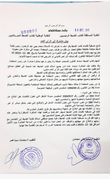 نواطشوط(وكالة السواحل للأنباء):دعت نقابتا كتاب الضبط جميع موظفي أسلاك كتابة الضبط إلى التوقف عن العمل لمدة ساعتين يوم الاثنين القادم ابتداء من الساعة العاشرة تضامنا مع رئيس كتابة الضبط في محكمة مقاطعة مكطع الحجار محمد يحي عبد الرحمن.