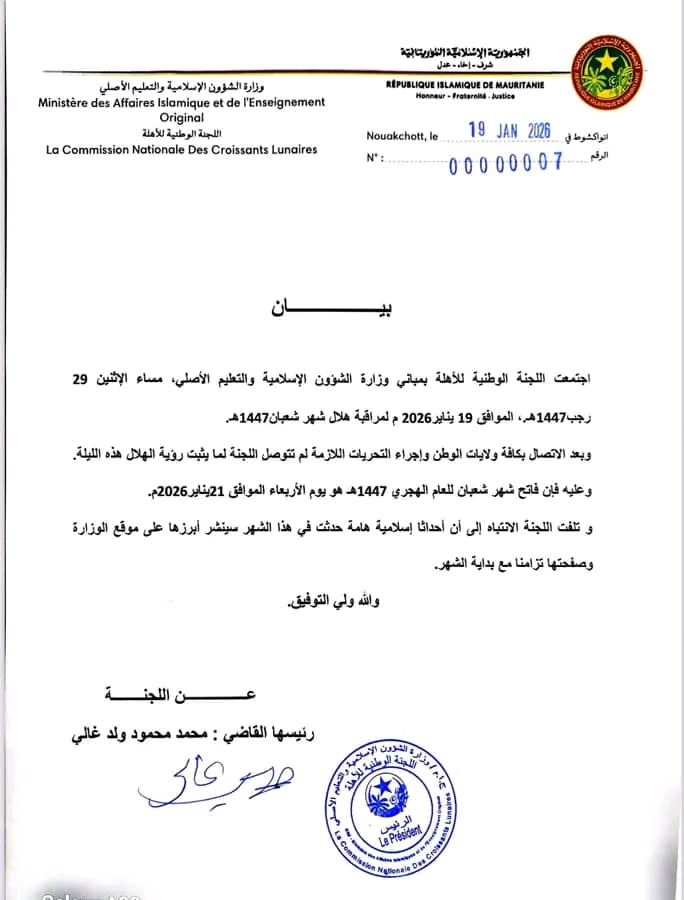 أعلنت اللجنة الوطنية للأهلة، فى اجتماعها يوم الأربعاء الموافق 21 يناير 2026 فاتح شهر شعبان للعام الهجري 1447هـ.