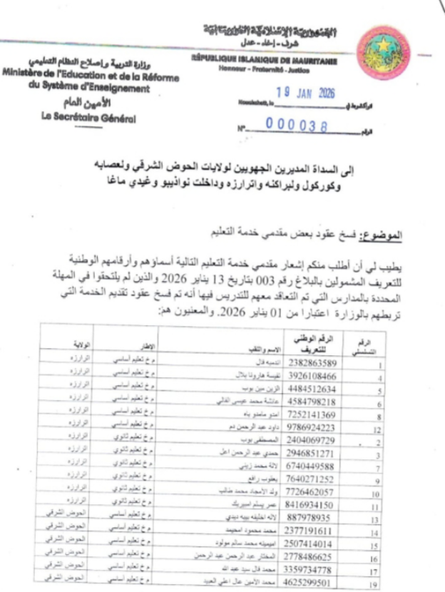 قامت وزيرة التربية هدى باباه بفسخ عقود 39 من مقدمي خدمات التعليم الذين طالبوا بحقوقهم ورواتبهم، ممن لم يلتحقوا في المهلة المحددة بأماكن تدريسهم، وفق بلاغ صادر عن الوزارة.